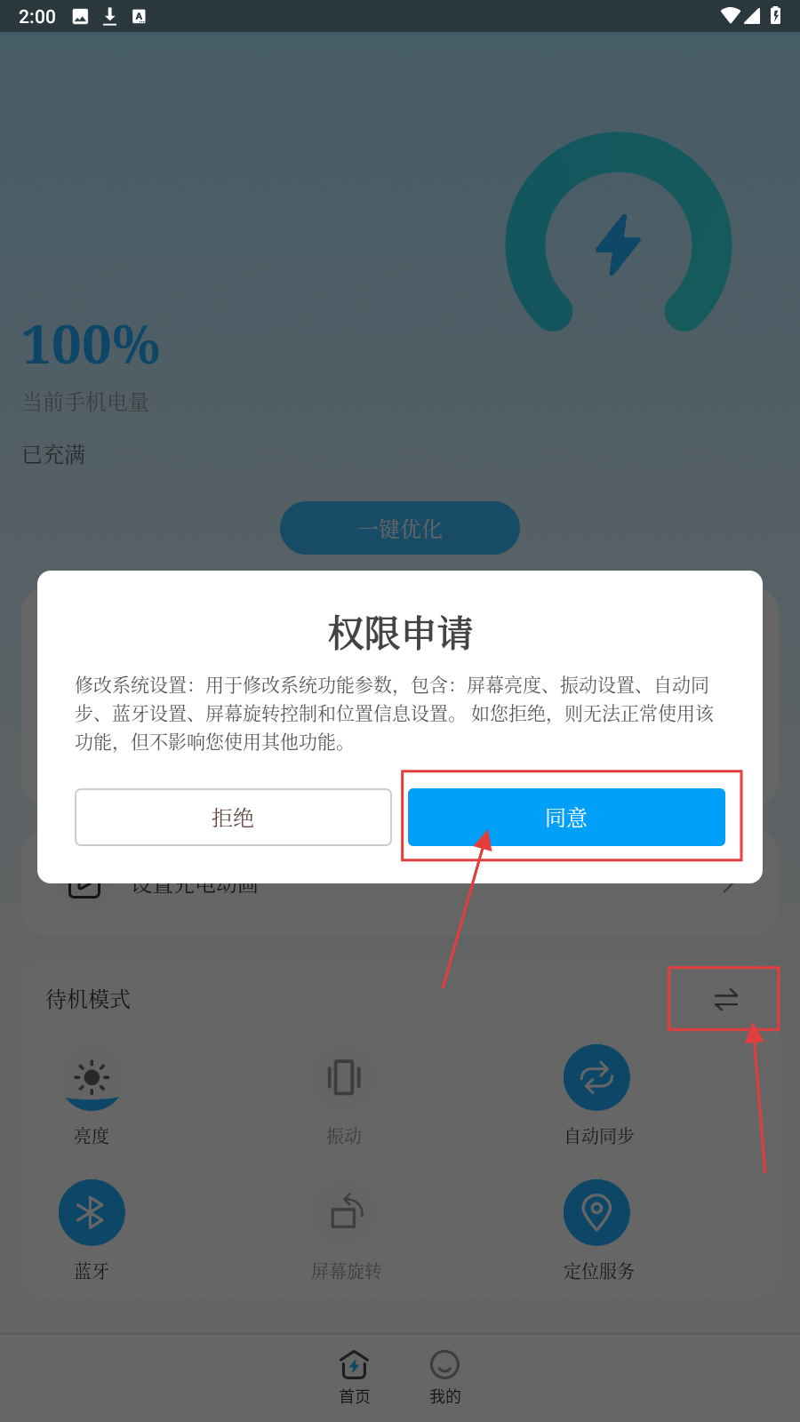 2、弹出【权限申请】框,提示需修改系统设置权限,点击【同意】,同时可操作【待机模式】旁的箭头图标。