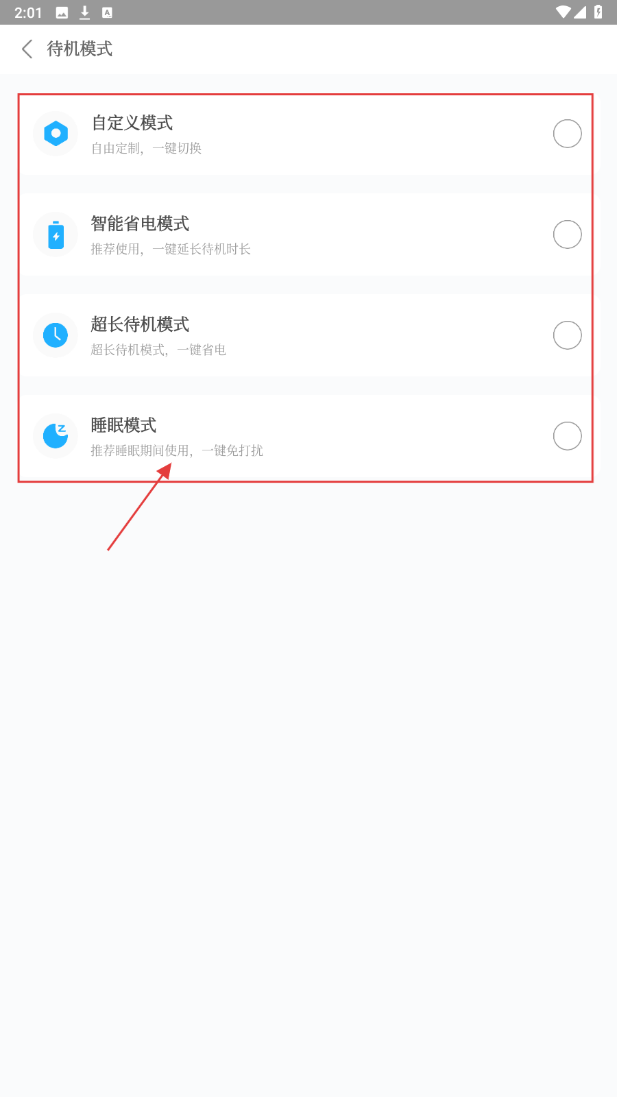 3、进入【待机模式】页面,可选择【自定义模式】【智能省电模式】等,如点击【睡眠模式】,设置对应待机方案。