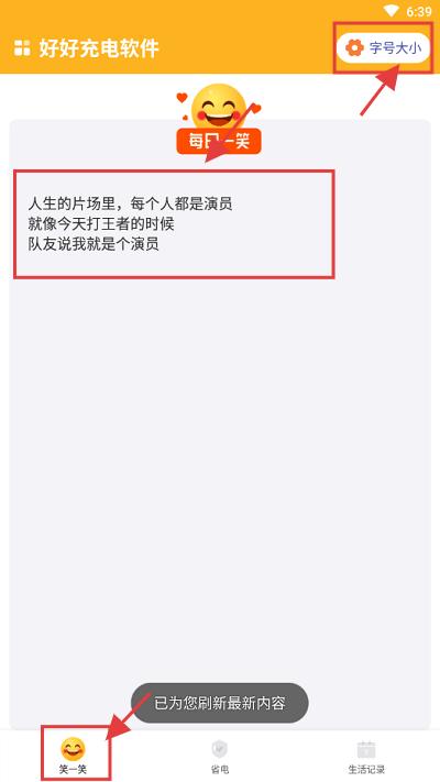 1、打开【好好充电】应用,在【笑一笑】页面,可查看趣味文案(如“人生的片场里…”),点击右上角【字号大小】调整显示字体。