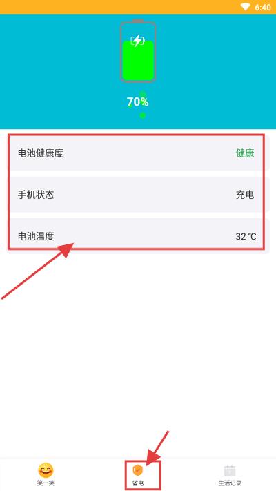 2、切换至【省电】页面,查看电池信息(70%电量、健康度、充电状态32℃等)。