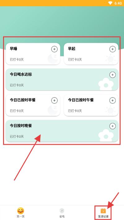 3、进入【生活记录】页面,可进行早睡、早起等打卡(如【今日按时晚餐】等项目),点击对应项目旁“+”打卡。