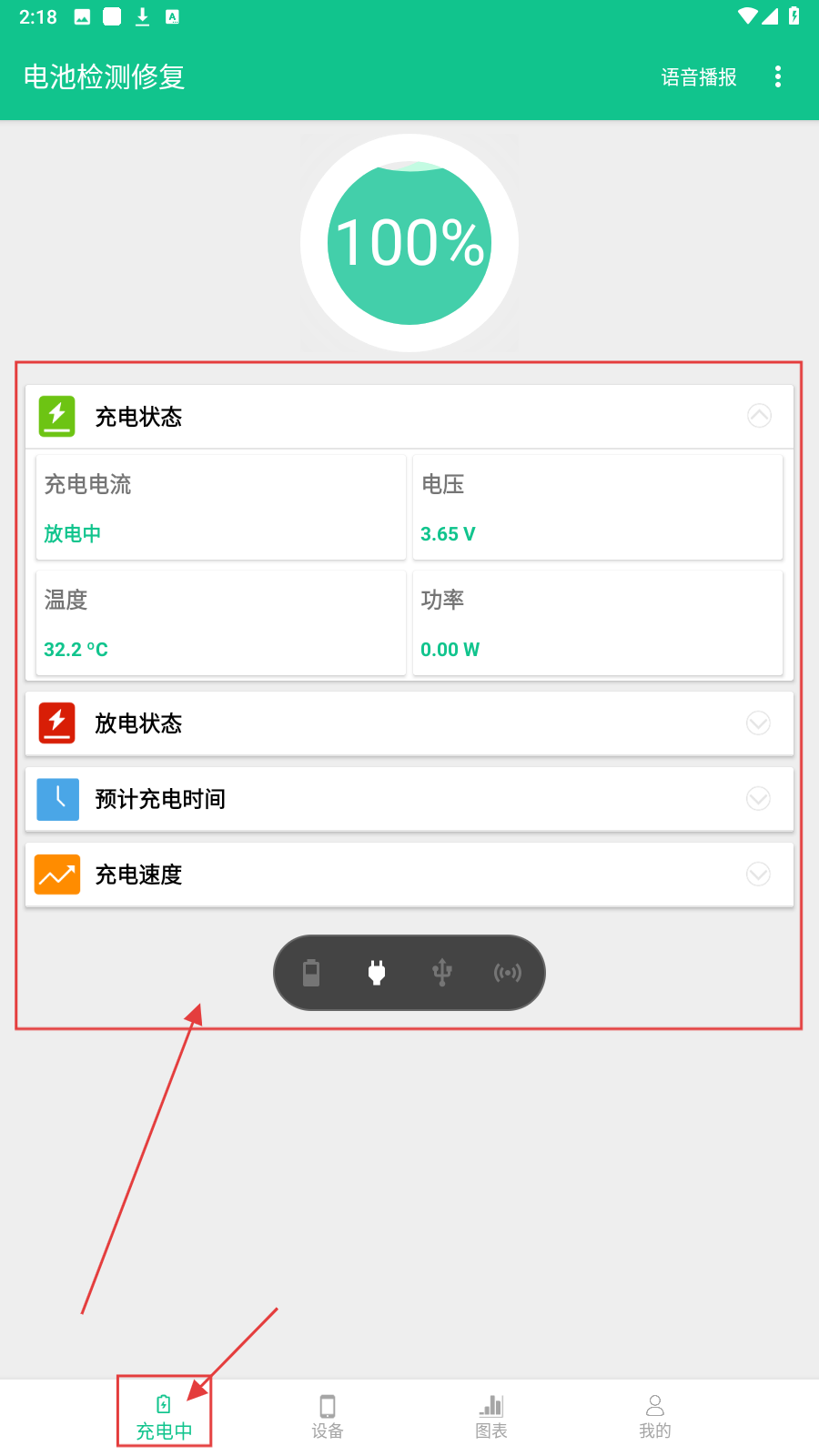 1、打开【电池检测修复】应用,在【充电中】页面,查看电池状态(充电电流、电压等),了解设备放电、预计充电时间等信息。
