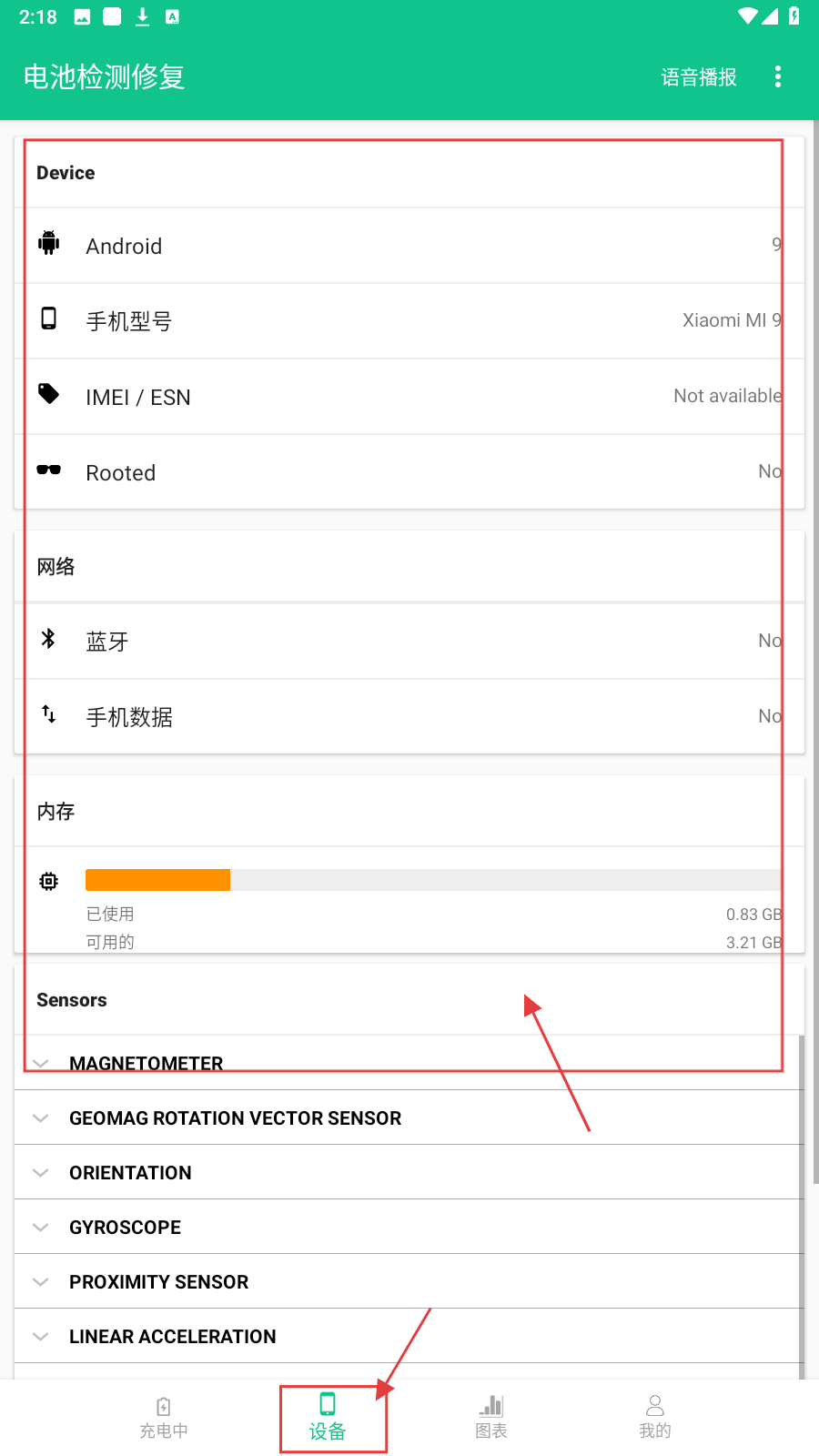 2、切换至【设备】页面,查看手机参数、网络(蓝牙、手机数据状态)、内存使用及传感器详情。