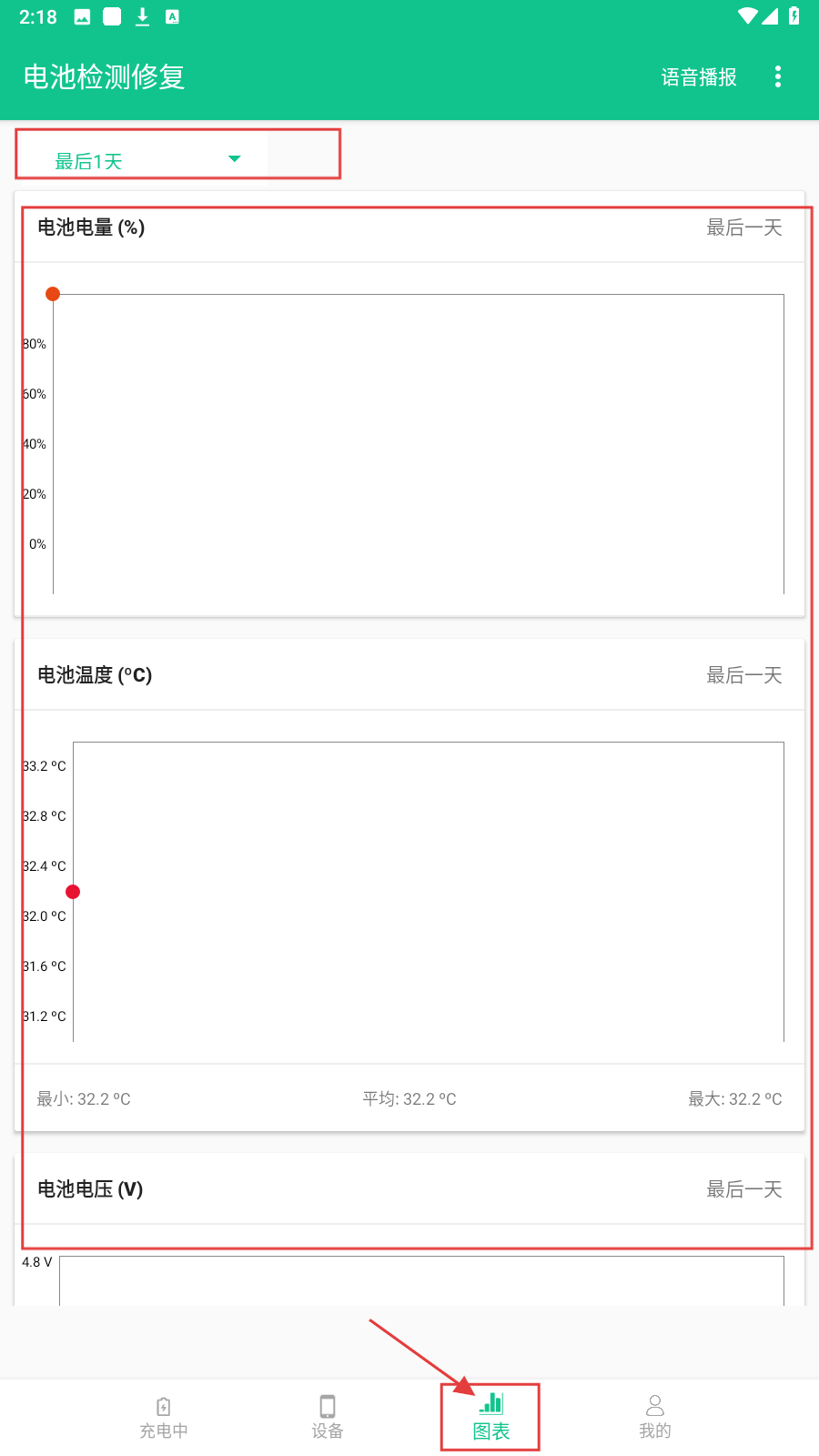 3、进入【图表】页面,选择时间范围,查看电池电量、温度、电压的变化图表,分析电池使用趋势。