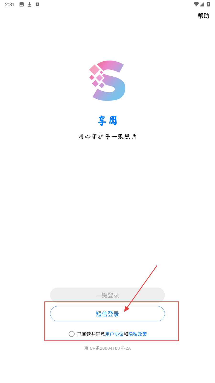 1、打开【享图】应用,在登录页勾选【已阅读并同意用户协议和隐私政策】,点击【短信登录】。