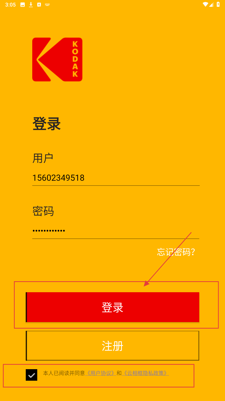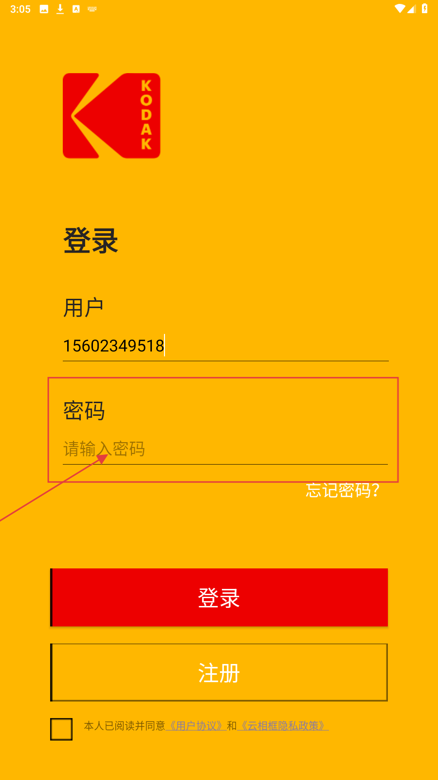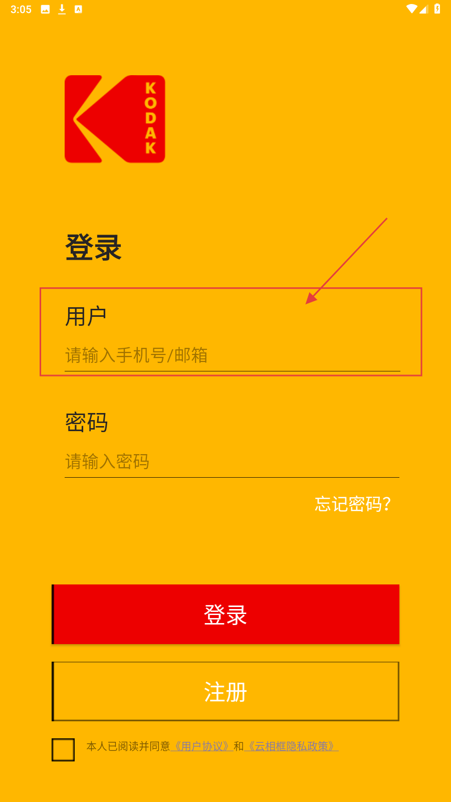 1、打开柯达经典云相框应用登录页,在【用户】栏输入手机号或邮箱。