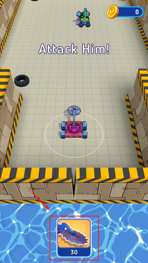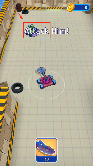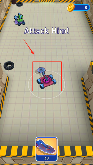 1、识别敌人:找到并识别游戏中的对手,如粉色小车。