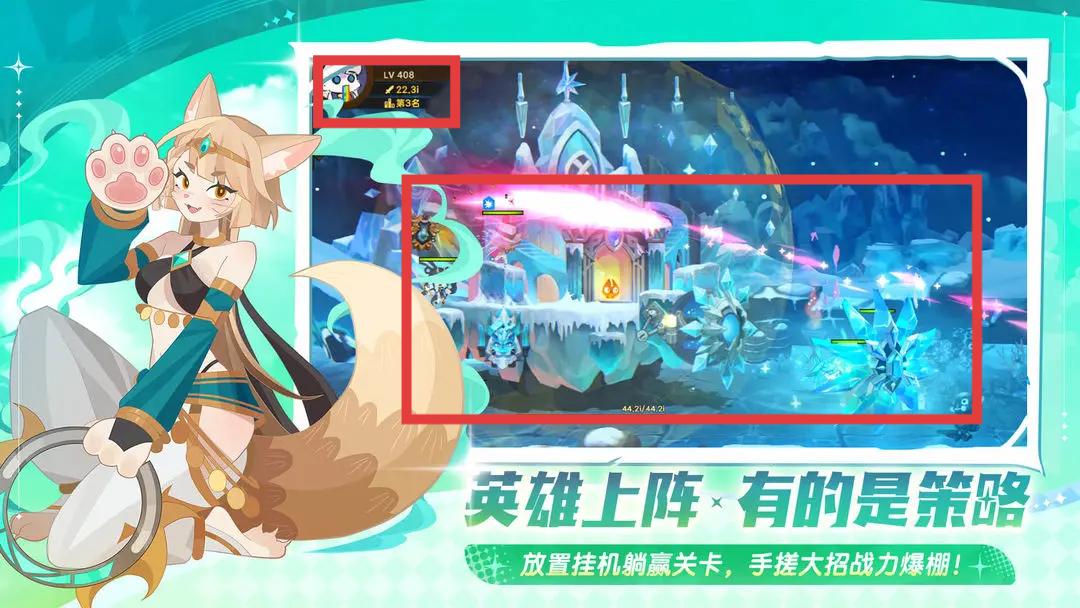 1、在战斗场景中,注意英雄等级和排名,合理安排英雄上阵。利用“放置挂机”轻松推进关卡,关键时刻手动释放大招,提升战斗输出。