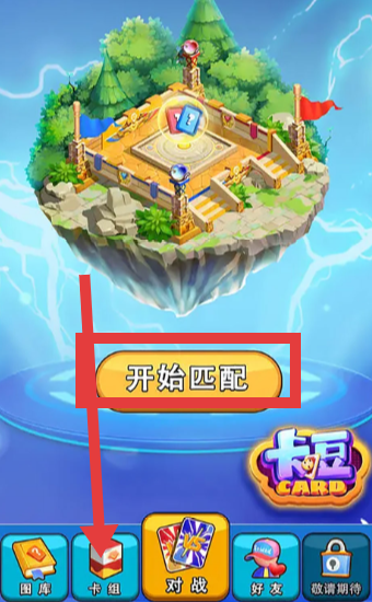 1、在主界面点击“开始匹配”可进入对战。也可提前点击“卡组”,从卡牌图库挑选卡牌。