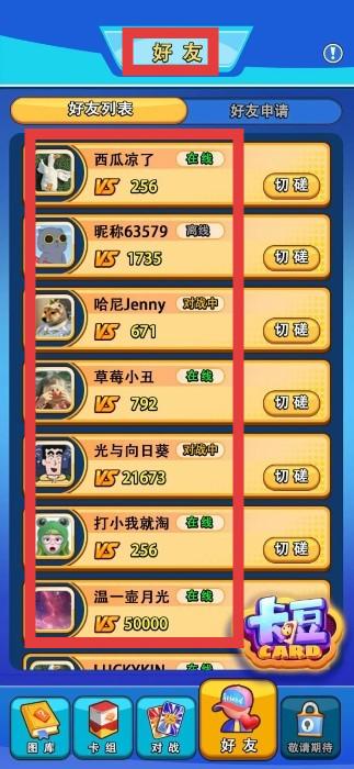 2、点击“好友”界面,查看好友列表及状态(在线、离线、对战中),可向在线好友发起切磋,通过与好友对战练习技巧,了解不同卡组策略。