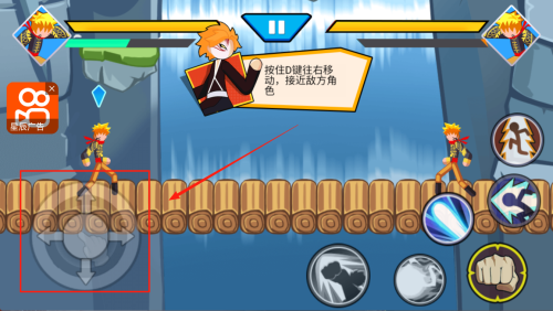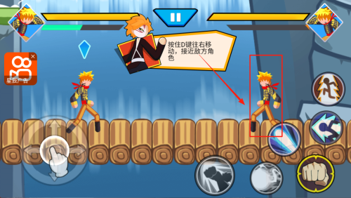 1、移动角色:按住D键向右移动,接近敌方角色。