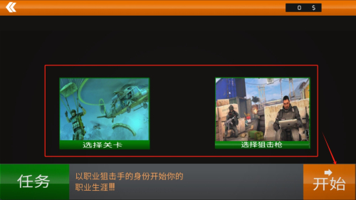 2、如何选择任务?在任务选择界面,点击“选择关卡”或“选择狙击枪”按钮,选择你想要挑战的任务或使用的武器。