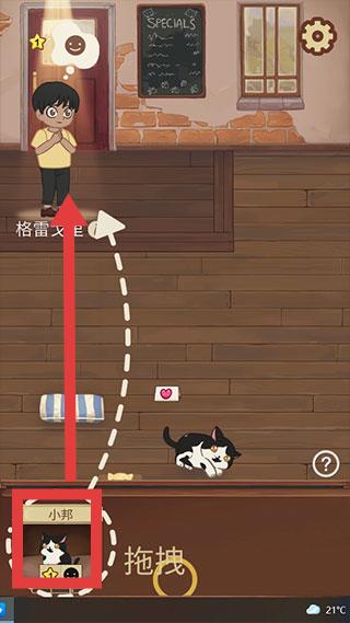 1、游戏中,可通过【拖拽】方式操控“小邦”等猫咪角色,让其与场景中的人物(如格雷戈)互动,可能会触发相应剧情或获得奖励。