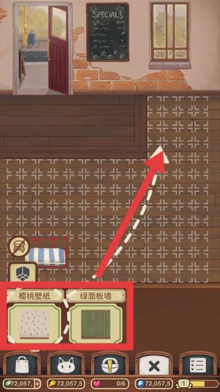 2、在装饰环节,利用【樱桃壁纸】【绿面板墙】等装饰道具,对游戏场景进行布置,满足游戏任务需求或提升游戏内的相关数值。