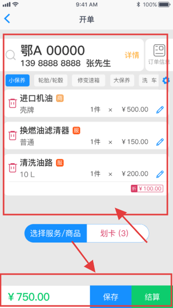 2、【开单】页添加服务(如进口机油、滤清器等),确认金额后,可【保存】或【结算】。