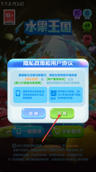 1、进入游戏,点击【同意】。