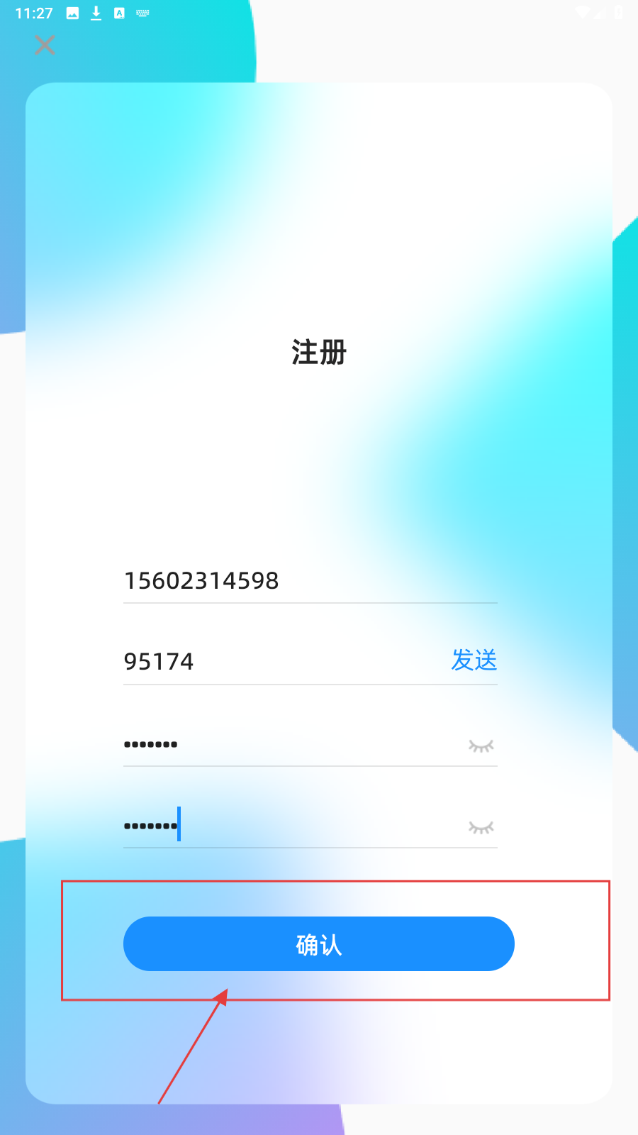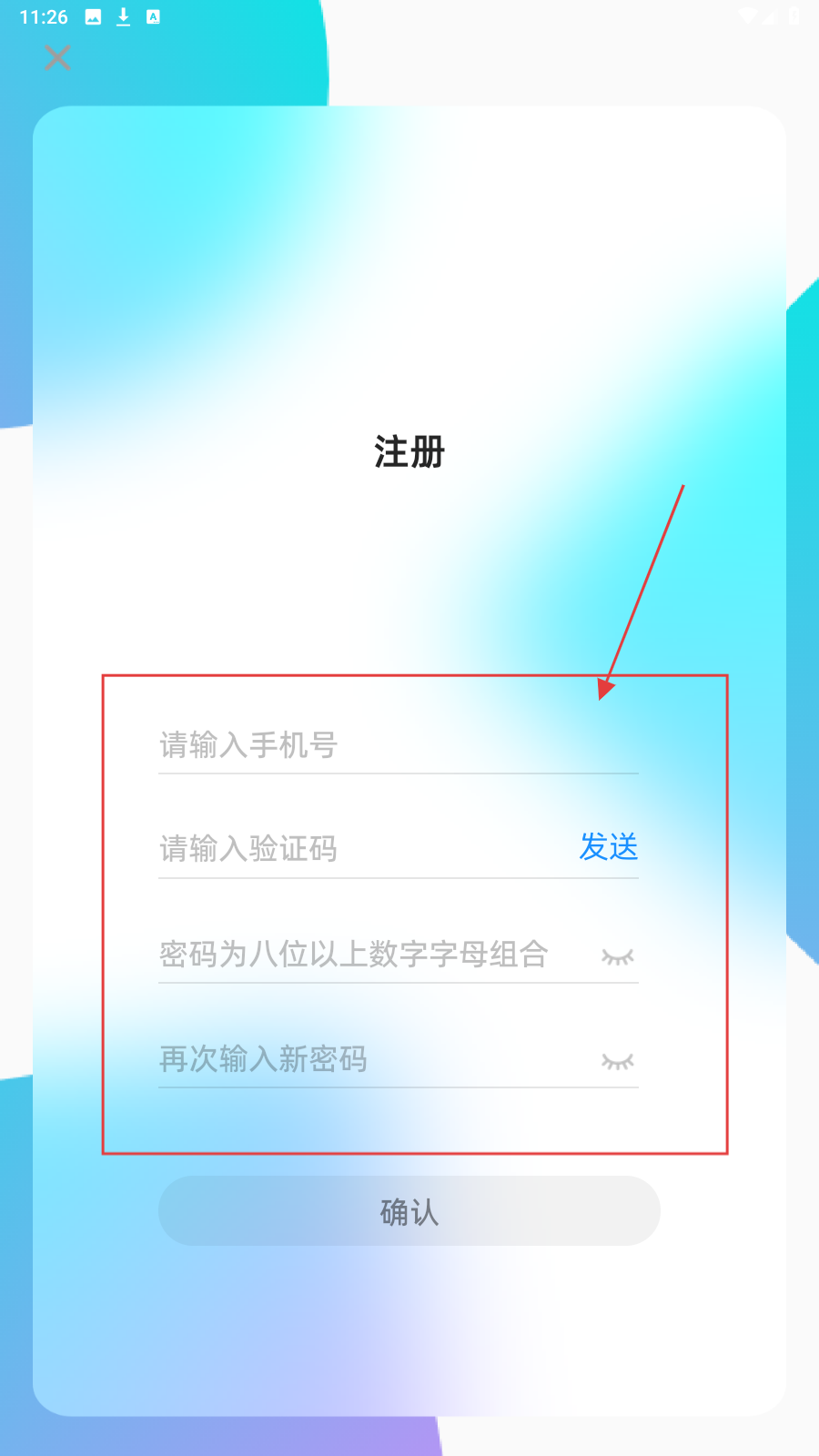 2、依次输入手机号,点击【发送】获取验证码并填入,设置8位以上数字字母组合的密码,再次确认密码。