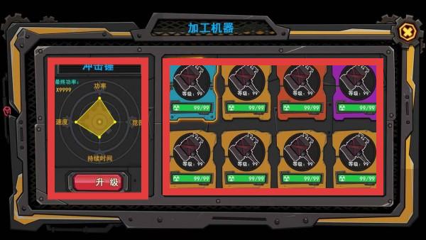 2、在“加工机器”界面,查看“冲压锤”等机器属性,包括功率、速度、范围、持续时间等。可根据游戏需求,点击“升级”按钮提升机器性能。