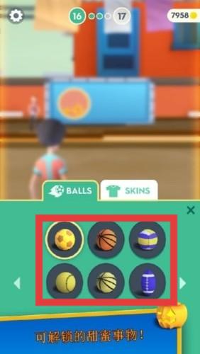 2、在道具选择界面,可看到(球)和(皮肤)选项。通过金币可解锁不同样式的球,丰富游戏体验,还可能获取“可解锁的甜蜜事物!”。