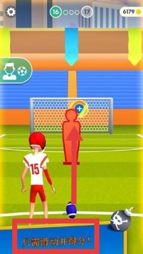3、在足球射门场景中,依据提示“只需滑动并得分!”,通过滑动屏幕操控角色射门得分,掌握该操作技巧以顺利通过关卡,提升游戏成绩。