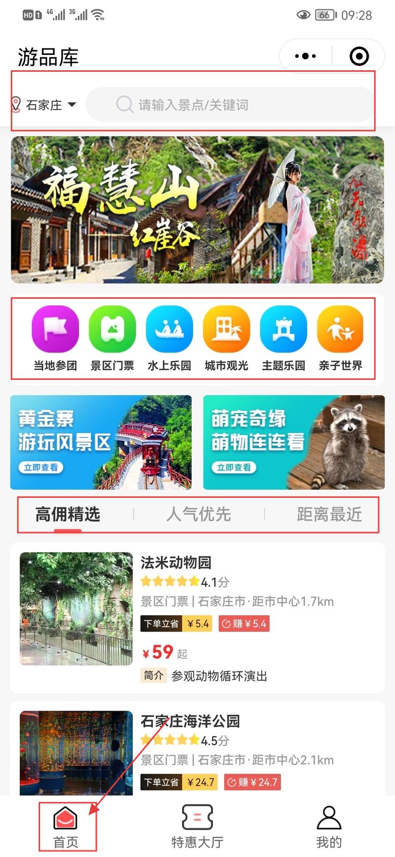 1、打开“游品库”,首页有【石家庄】城市选择、搜索框,还有【当地参团】【景区门票】等功能入口,可按需点击进入对应旅游服务。