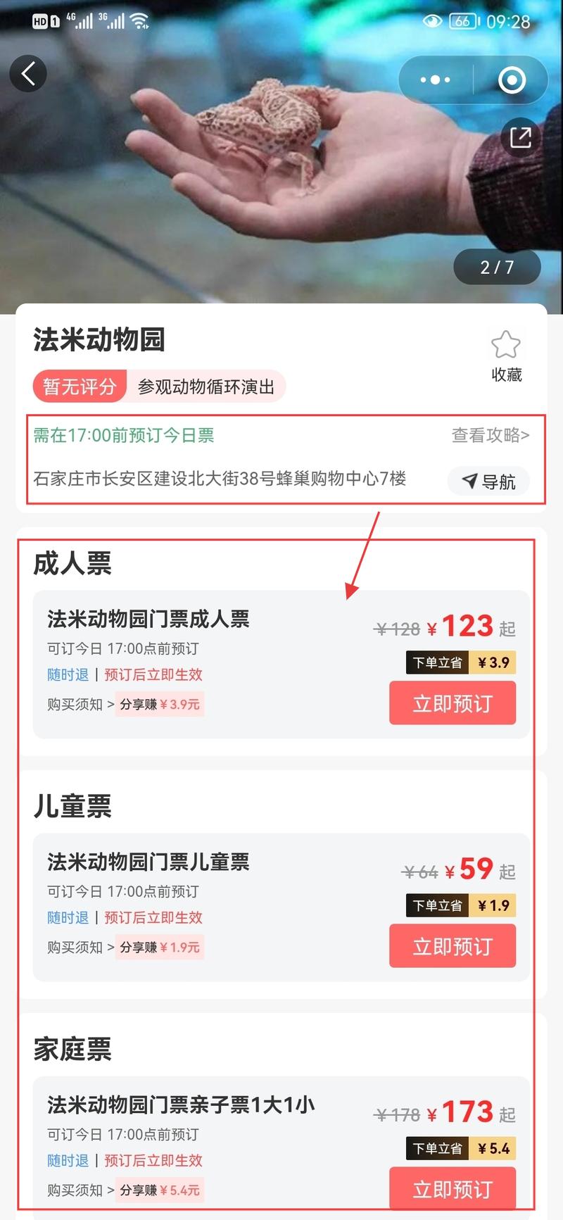 2、进入景区详情页(如法米动物园),查看评分、地址、门票类型(成人票、儿童票等)及价格,点击【立即预订】可下单购票。
