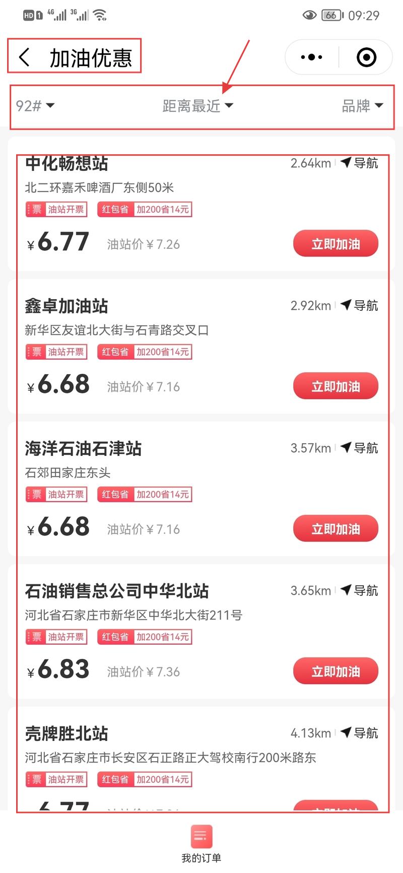 3、切换到【加油优惠】页,可筛选油号、排序、选品牌,查看加油站列表,点击【立即加油】进行加油操作。