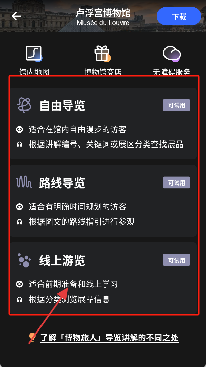 2、在导览功能页,有【自由导览】【路线导览】【线上游览】等选项,按需点击使用对应导览服务。