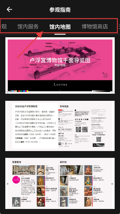 3、切换到【参观指南】的【馆内地图】标签页,查看卢浮宫平面导览图及展区、展品介绍,辅助规划参观路线。
