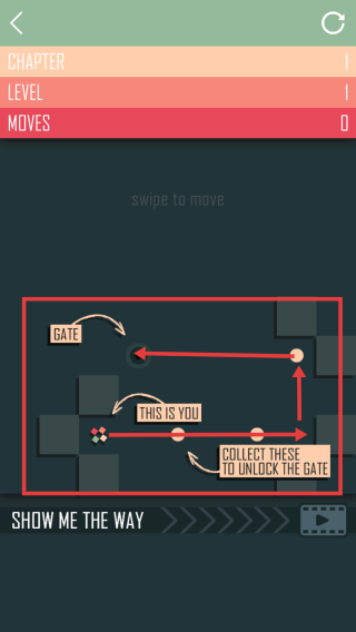 2、进入游戏关卡,根据提示“swipetomove”,通过滑动屏幕操控角色移动,收集指定物品来解锁大门(GATE),完成关卡目标。