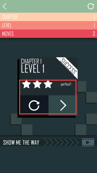 3、成功通过关卡后,会显示星级评价和“perfect!”。可点击重新开始按钮再次挑战本关争取更好成绩,或点击右箭头按钮进入下一关游戏。