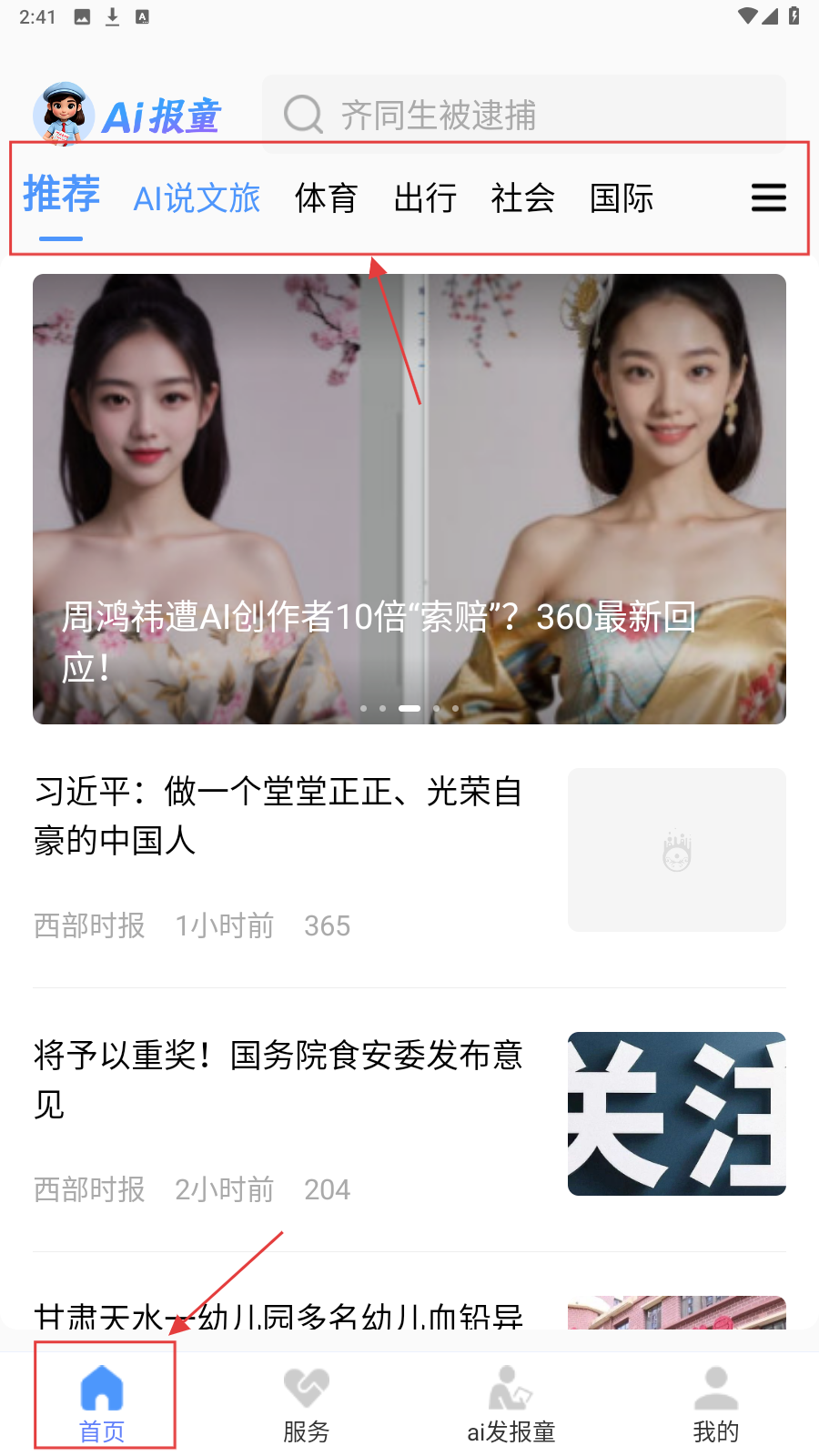 2、点击底部【服务】进入服务页,有【AI报童】【医触即达】等功能入口。