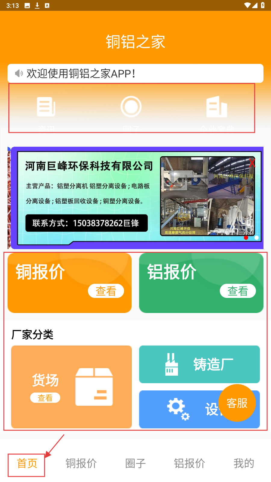 1、打开“铜铝之家”APP,首页有【资讯】【圈子】【企业宝典】等入口,还有【铜报价】【铝报价】及厂家分类,点击对应板块可查看信息。