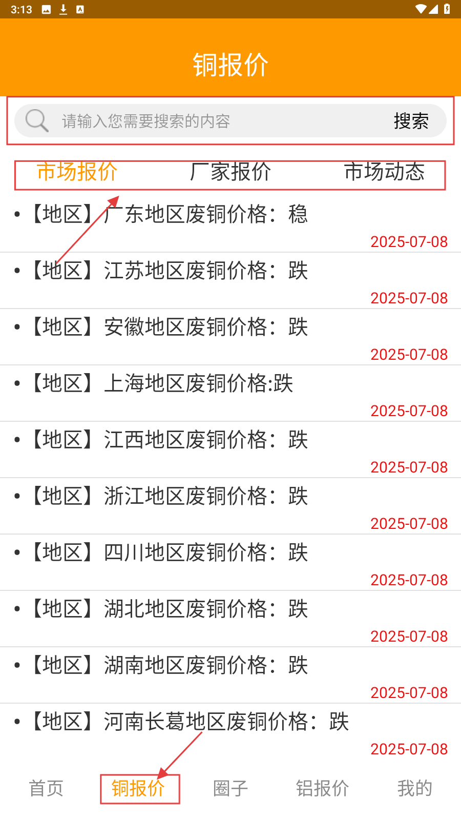 2、切换到【铜报价】页,通过搜索框或【市场报价】【厂家报价】【市场动态】标签,查看各地区废铜价格。