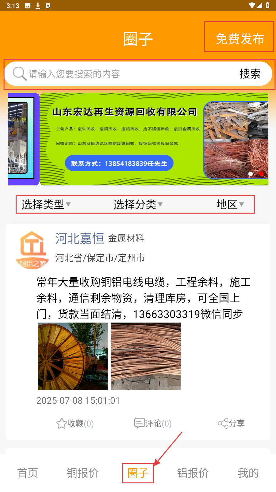 3、进入【圈子】页,可【免费发布】信息,用搜索框或筛选【类型】【分类】【地区】,浏览企业发布的铜铝回收、收购等供需内容。