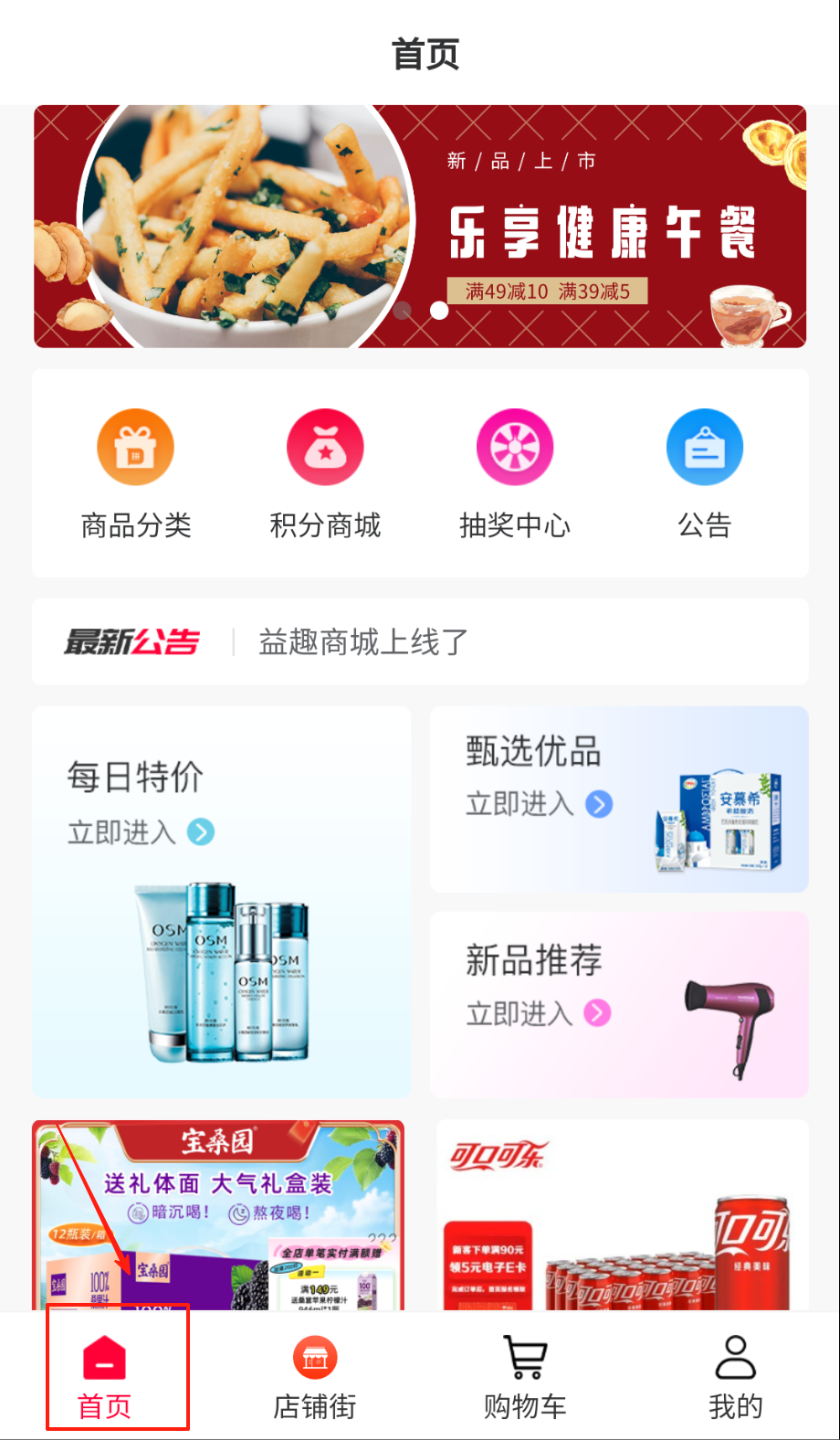 1、首页选"粮油专区"触发限时折扣,红点标注新上线满减券,收藏功能标记常购商品,店铺街地图定位最近超市哦。