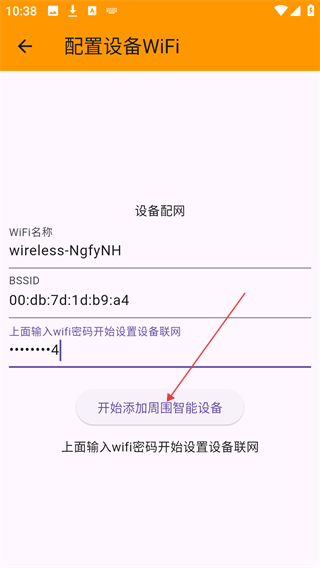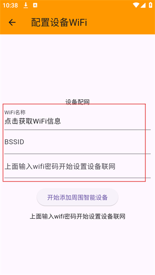 3、在配置设备WiFi页面,点击“获取WiFi信息”自动填充当前网络的WiFi名称与BSSID,然后输入该WiFi的密码。