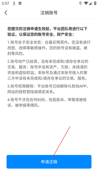 4、在账号注销验证说明页面,确认自身账号符合安全、财产结清等注销条件后,点击【申请注销】按钮,提交账号注销申请。