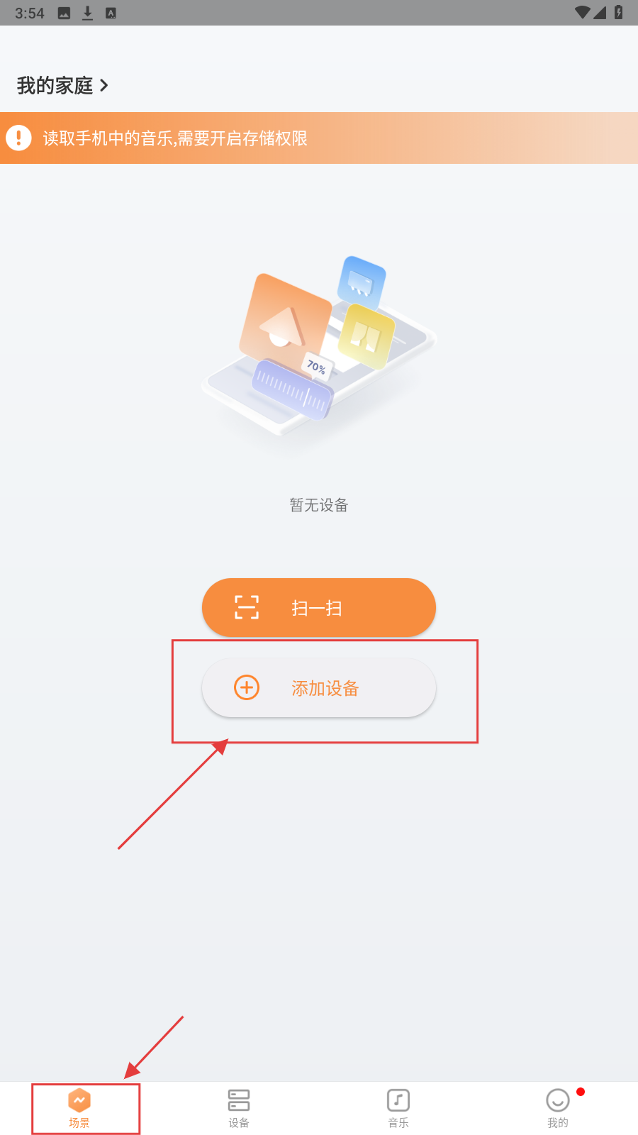 1、在【场景】页,点击【添加设备】进入设备添加流程。