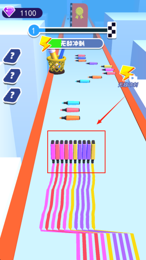 2、滑动控制方向:通过滑动手指改变水彩笔的左右移动方向,避开赛道上的路障、陷阱等障碍物,保持奔跑节奏。