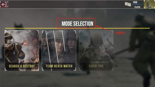 2、如何选择游戏模式?在模式选择界面,点击“MODE SELECTION”查看不同的游戏模式,如“SEARCH & DESTROY”、“TEAM DEATH MATCH”或“RAPID FIRE”。