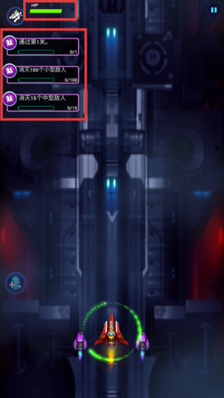 1、操控红色战机,躲避敌人攻击并消灭敌人。关注屏幕上方“HP”生命值条,留意左侧任务栏,完成“通过第1关”等任务获取奖励。