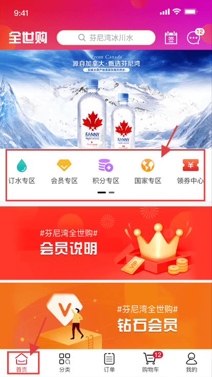1、打开“芬尼湾全世购”APP,在【首页】有【订水专区】等功能区,可按需进入。