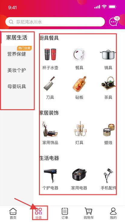 2、点击【分类】,浏览【家居生活】(营养保健等)、【厨具餐具】(杯子水壶等)等分类商品。
