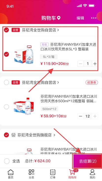 3、切换到【购物车】,查看已选商品(如芬尼湾冰川水),点【去结算】完成购买。