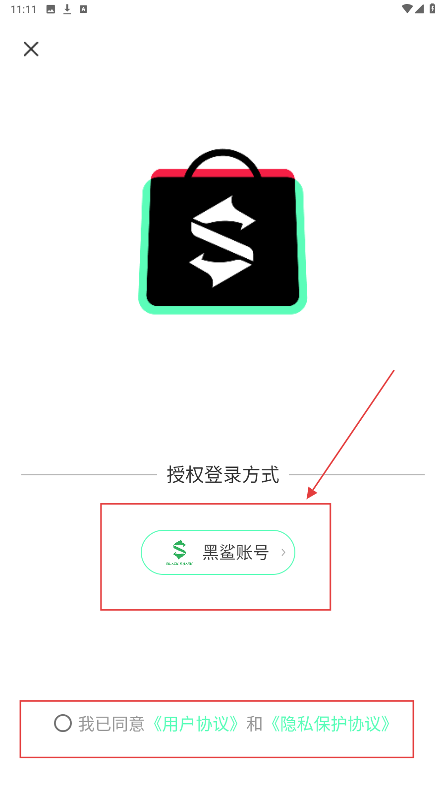 2、选【黑鲨账号】,勾选【我已同意《用户协议》和《隐私保护协议》】。