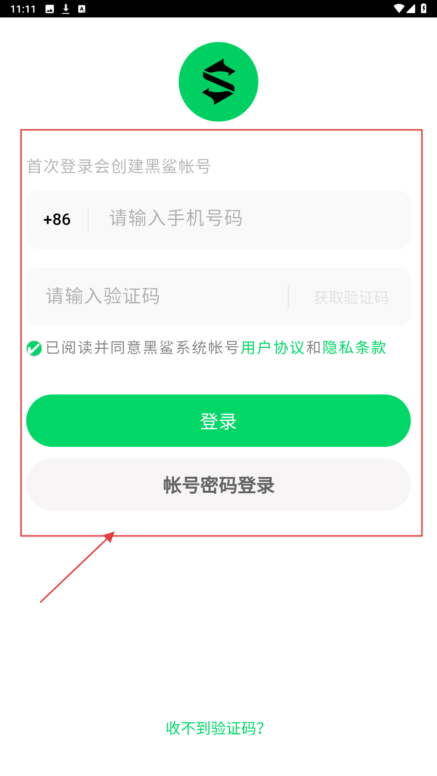 3、在黑鲨账号登录页,填手机号、验证码(或选账号密码登录),点【登录】完成操作。