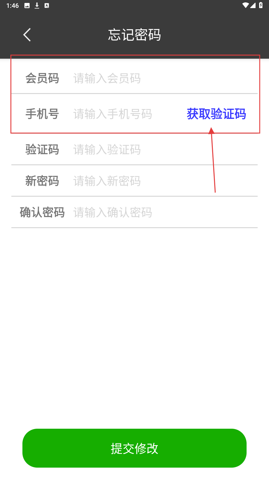 2、在找回页面的【会员码】和【手机号】处填写相应信息,然后点击【获取验证码】。