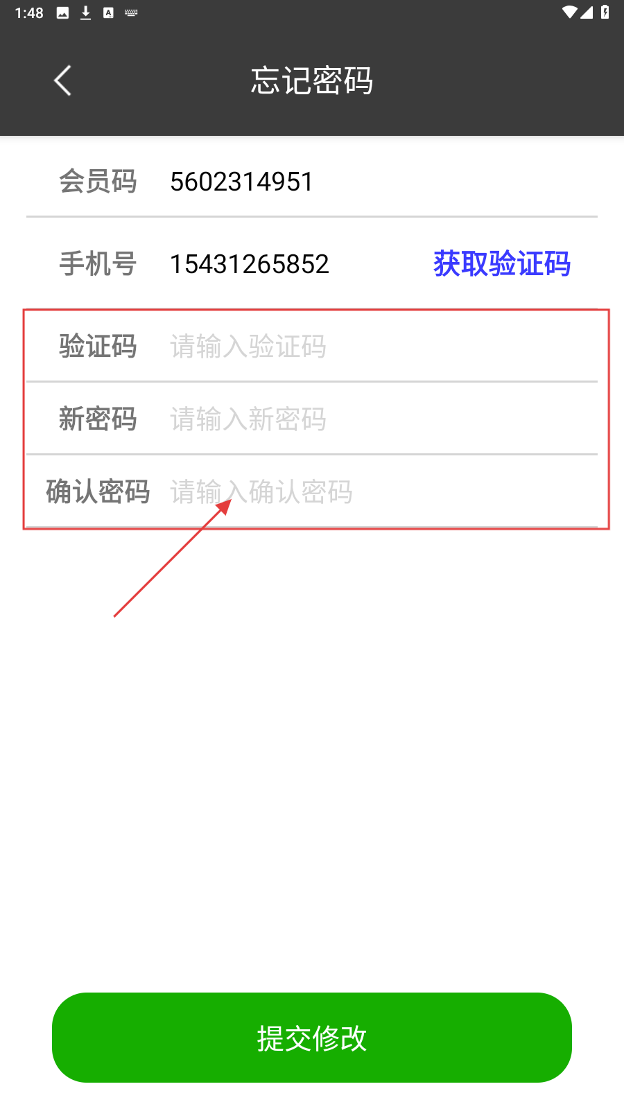 3、收到验证码后,将其填入【验证码】框,接着设置【新密码】,并在【确认密码】处再次输入新密码以确认。