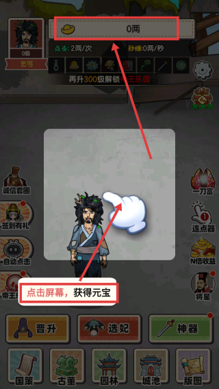 1、游戏起步阶段,多【点击屏幕,获得元宝】,积累初始财富。